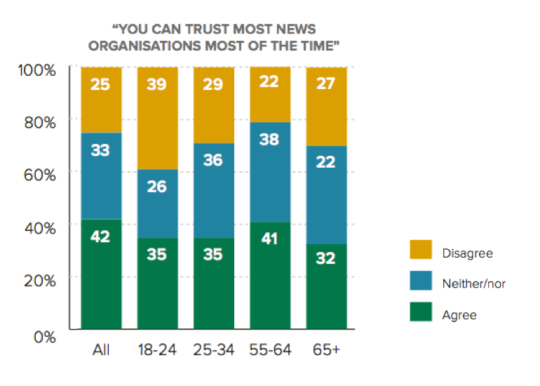 The most general statements, about news overall, commands the highest levels of agreement, with around half of respondents agreeing and one in five disagreeing. Younger age groups are less likely to agree, and 28% of 18–24s say they disagree that news in general can be trusted (see Figure 3).