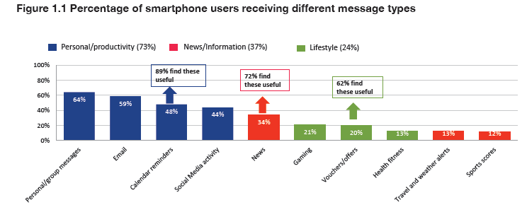 In general, personal messages are most used and considered most valuable by smartphone users, with, for example, 89% of those that receive calendar reminders finding these useful. Fewer people use news alerts and sports scores but satisfaction levels are high (72%). Leisure alerts are generally used less and valued less.