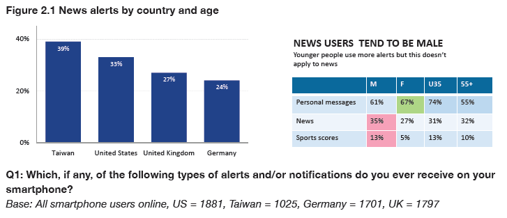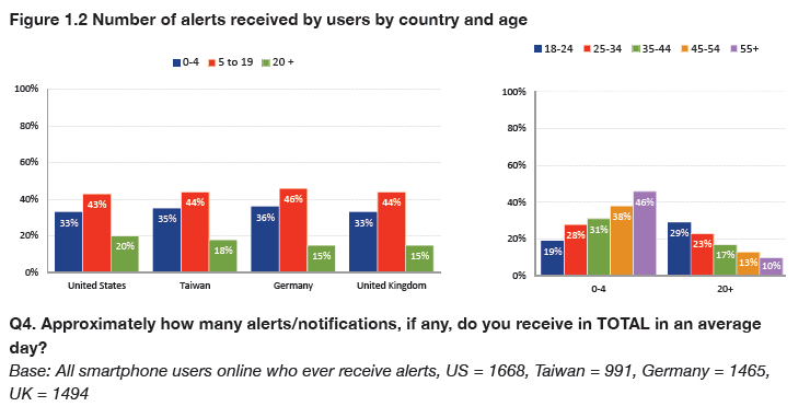 But our research also suggests there is considerable growth potential for publishers because (1) smartphone use continues to increase, (2) those markets where smartphones have higher penetration have a higher number of alerts (Taiwan), and (3) younger groups are disproportionally using notifications and building them into their daily habits.