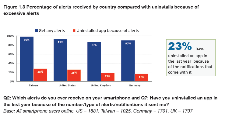 fig-1-2Around nine in ten smartphone users (92%) get some kind of alert at least once a day. About a quarter in some countries say they have uninstalled an app in the last year because of the excessive number of alerts/type of alerts they receive. This number is greatest in Taiwan (28%) and least in Germany (17%).