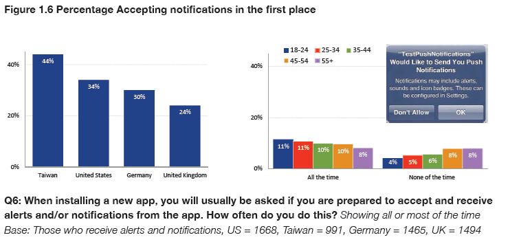 • Some countries are more resistant that others. Only a quarter of smartphone users (23%) in the UK say they typically accept notifications when the choice is offered. This compares with over two-fifths (44%) in Taiwan.