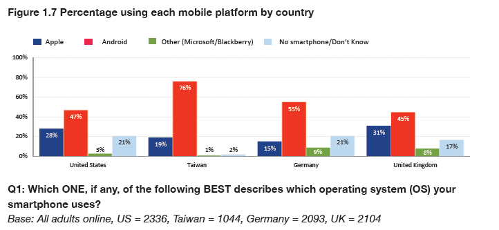 This research is based on a survey of smartphone users in four countries conducted by YouGov between 26 September and 10 October 2016. Total sample size was 7,577 adults in the UK, US, Germany, and Taiwan. The survey was carried out online. The table below sets out the sample sizes in each country.