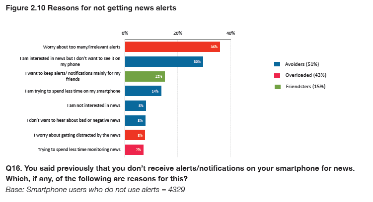 Clearly there are overlaps between these three groups of Avoiders, Overloaded, and Friendsters, but the extent to which people can be persuaded to engage with news alerts will likely depend on these core motivations, which in turn are based on the wider context of their lives.
