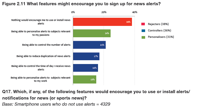 • In terms of prospects for growth, around four in ten (38%) of those not getting news alerts say they have ‘no interest’ in taking them in the future. About a third (31%) might use them if more personally relevant alerts could be sent, while an even bigger group (36%) might use them if they could control the number and timing of alerts.