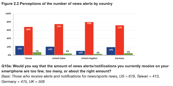 • The majority of those receiving news alerts (73%) are happy with the number of alerts they receive. Taiwanese smartphone users are most likely to complain they get too many alerts (22%), compared with just one in ten (10%) of those in the UK.
