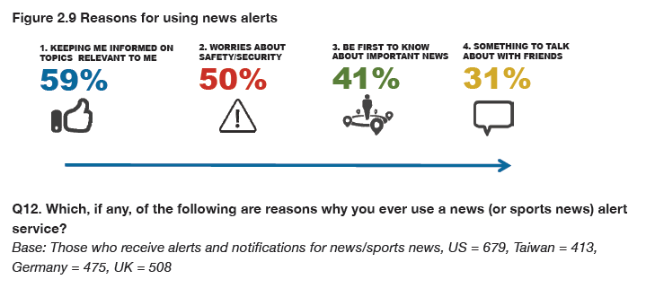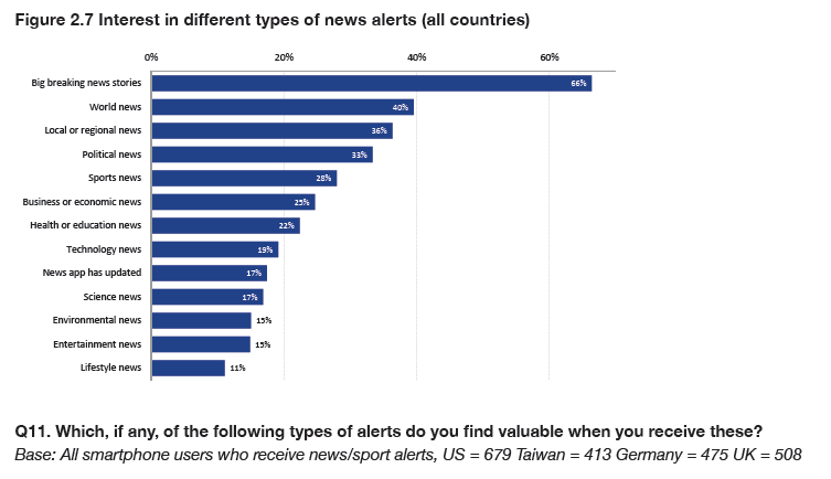But how do consumers feel about the rising tide of alerts on their smartphones? Are they engaged or annoyed? What makes a good or bad alert? How important is news as a notification category and how might these alerts develop in the years ahead? These were some of the key questions we wanted to address in this research paper using quantitative and qualitative methods across four countries.