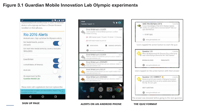 Overall, the Guardian found that the ‘utility-based’ medal alerts and leaderboards were much more valued by users than the interactive quizzes and polls. Critically, it also found that if personalisation was offered, it would be used, even if – as in this case – there were over 200 country-based options. The Guardian also ran experiments via Android’s Chrome browser for the Brexit vote and during the US presidential election debates.