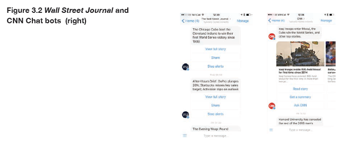 Chatbots are artificially intelligent programmes that interact with people through messaging apps like Facebook Messenger, WhatsApp, Kik, or Line. Publishers are interested because these platforms have almost as many users as social networks, though very few are currently using these for news. In April, Facebook opened up its Messenger platform to let publishers (and brands) interact with its one billion active users. Because Messenger is an app, it is also possible for publishers to use this mechanism to deliver alerts direct to the lockscreen on Apple or Android devices. Subscribers to CNN receive a daily digest of top stories right within the Messenger interface (see Figure 3.2). The bot can also recommend personalised content based on a user’s preferences and learned interests or it can hold a conversation with a user about an ongoing story.