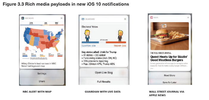 Equally significant has been the overhaul of the entire notifications system within the iOS 10 operating system. This enables a much richer set of menus to be offered along with rich media such as videos, graphics, and even live data being pushed directly to the lockscreen. [8. https://www.niemanlab.org/2016/06/video-notifications-apple-news-subscriptions-and-other-takeaways-for-publishers-from-apples-wwdc-2016-keynote/ cations-apple-news-subscriptions-and-other-takeaways-for-publishersfrom-apples-wwdc-2016-keynote