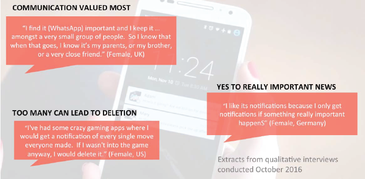 Users were generally confident to swipe/delete notifications if they weren’t relevant but some news brands were specifically chosen because they could be trusted not to send too many alerts.