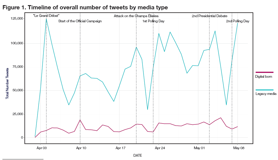 The first step in our analysis is to assess the distribution of news content volume throughout the electoral campaign cycle. Figure 1 shows the overall volume of tweets about the French Presidential elections by type of news media. The category legacy media includes national daily newspapers, monthly and weekly newspapers, regional and local daily newspapers, magazines, news agencies, radio, broadcasters and free national newspapers. Digital-born news media include a variety of news-related organisations launched online, most of them recently. The main findings of this longitudinal analysis are: