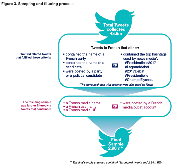 Our dataset contains 2.96 million tweets collected between 2 April and 8 May 2017. We use a supervised third-party software for Twitter data collection, named Kalium, which calls the Streaming API. As Morstatter, Pfeffer, Liu, & Carley (2013) note the essential drawback of the Twitter Streaming API is the lack of information concerning what and how much data one gets. Yet we do know that it allows us to retrieve at most a 1% sample of all the data matching a set of pre-determined parameters (see Morstatter et al., 2013 for a systematic comparison between the Streaming API and the Twitter Firehose data).