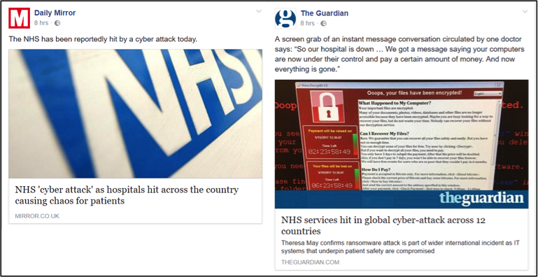 Apart from the distinctiveness of the content itself, the way news is presented in social media is another possible explanation of the differences in news brand attribution. Immediately after the NHS cyber-attack in May 2017, Daily Mirror (27% of correct brand attributions from news stories accessed via social media) posted a link of the story on Facebook with a generic text accompanying it with an image of the NHS logo. Contrast this with a post from the Guardian (69% of correct brand attributions from news stories accessed via social media), which provided more explanatory text along with a more compelling image. The Guardian also ‘burnt in’ a logo on the image to provide extra branding. These differences enabled the Guardian’s post to take up more space in the news feed than the equivalent post from the Mirror.