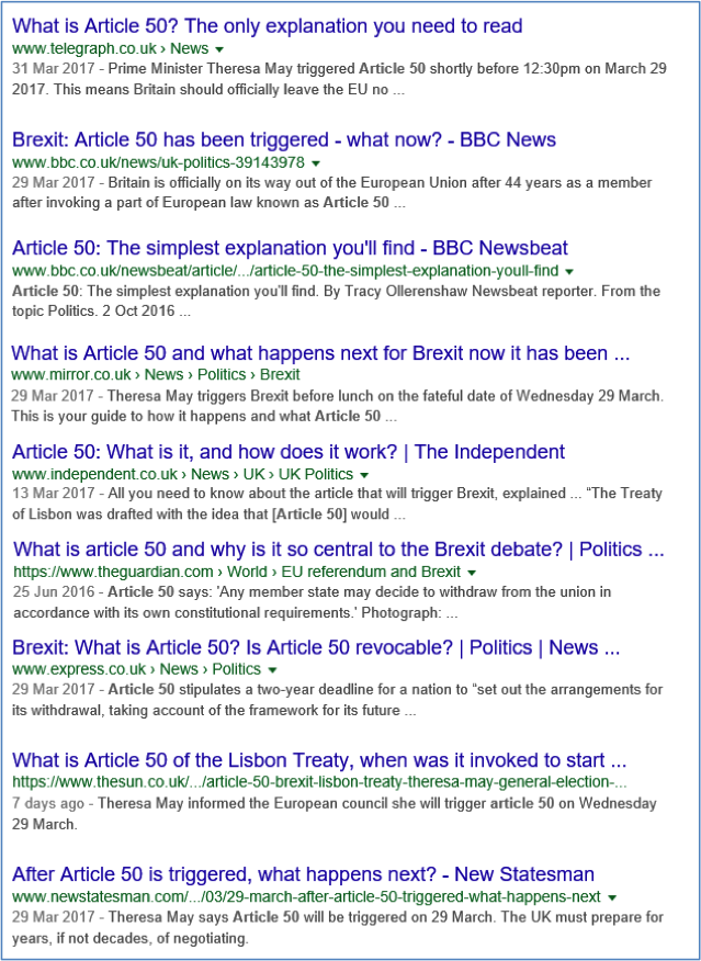 One can assume that opinion stories may benefit from being about hard news topics that, as we have already seen, tend to achieve higher brand recognition. Explainers that often try to answer questions from users looking for specific information have become a particularly popular format as a way of gaining traffic from search optimisation. This can lead to similar and formulaic output. One example can be seen when conducting a Google search about a complex current affairs issue in the UK (the triggering of Article 50). Findings from news sites in the resulting pages show a list of almost identical headlines from a wide range of UK news outlets. If it is hard to distinguish between the headlines and the snippets, it is perhaps not surprising that the brand is less identifiable.