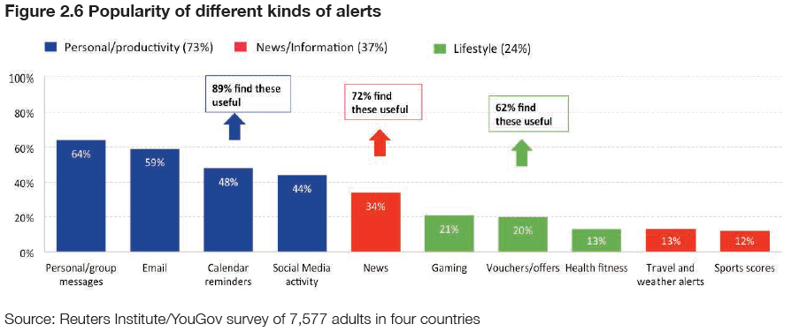 Our report on this subject, News Alerts and the Battle for the Lockscreen (Newman, 2016), 19 shows that news and sport are already some of the most highly valued notifications, but they have to fight for their place alongside personal messages, productivity alerts, shopping and games.