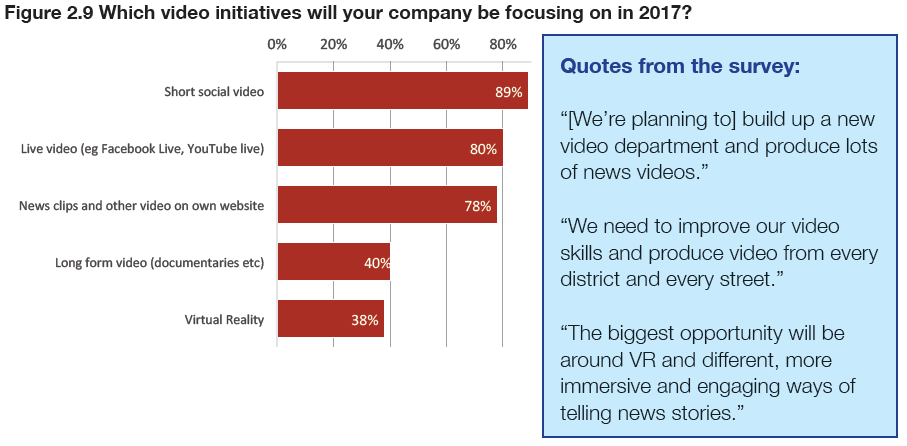A key question in 2017 is how the already tense relationship between publishers and platforms will develop. In our survey almost half (46%) said they were more worried about the role and influence of platforms compared with last year. Fewer than one in ten (9%) were less worried. Despite this, the vast majority of publishers plan to continue to invest heavily in Facebook and to a lesser extent other platforms this year. Three quarters (73%) said that their overall digital strategies aimed to strike an equal balance between their own websites/properties and distributing content via third parties with only a fifth (21%) saying they would be mainly focusing on their own sites and platforms.