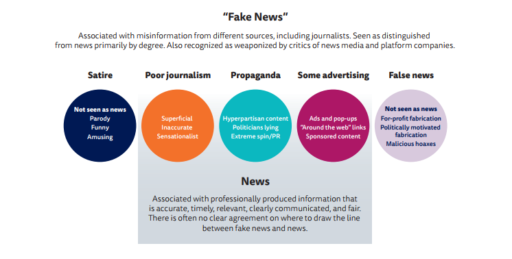 - When asked to provide examples of fake news, people identify poor journalism, propaganda (including both lying politicians and hyperpartisan content), and some kinds of advertising more frequently than false information designed to masquerade as news reports;