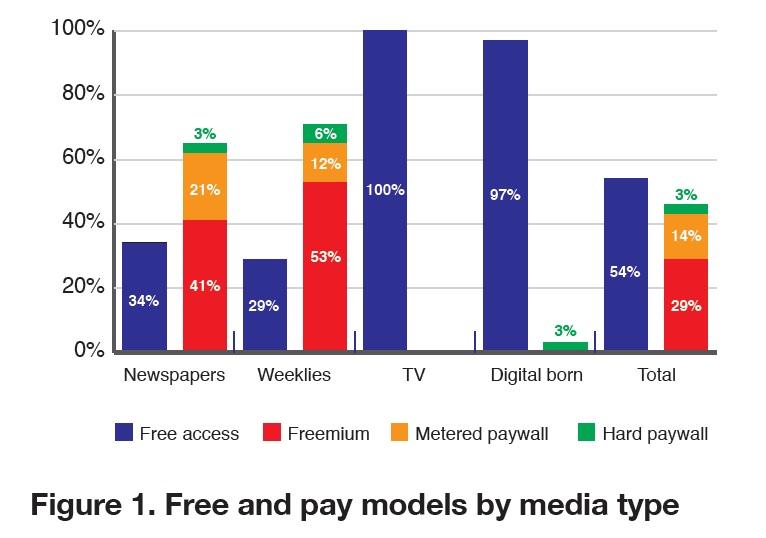 • 66% percent of the newspapers operate a pay model. Freemium models, where some content is freely available, but premium material only available for paying users, are the most widely used, followed by metered paywalls that allow free access to a limited number of articles each month before requiring payment.