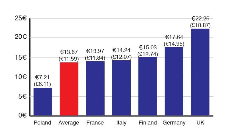 • Prices vary by content (business, up-market, mid-market, tabloid papers). Business newspapers are unsurprisingly clearly more expensive than others, with an average monthly price of €25.67 (£21.76) across the six countries (varying from €6.71 (£5.69) to €54.27 (£46)).