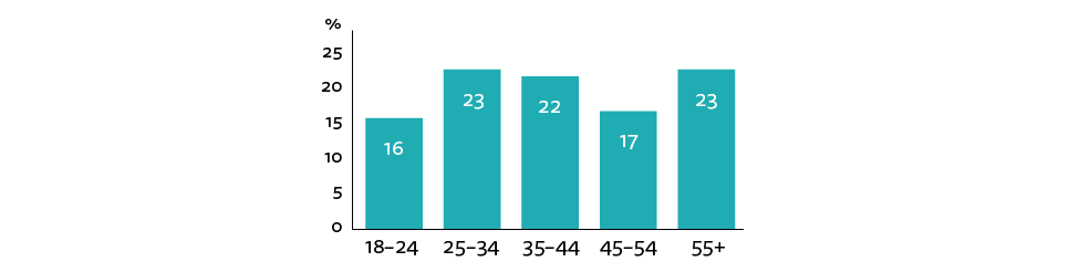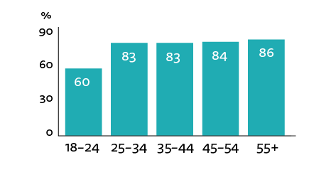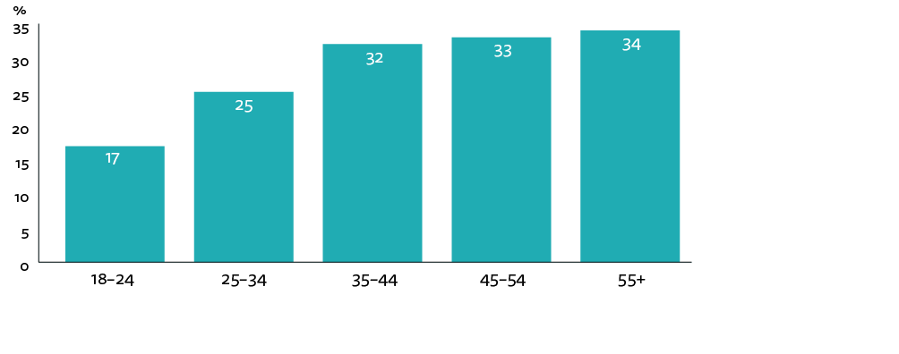 In addition, we see that age is a significant driver of trust. The youngest respondents have the lowest level of trust in news overall, with just 27% in the 18–24 age group, whereas the figure is 45% for over 45s (see Fig 45). The same applies to trust in the ‘news I use’, where the older the respondents the higher the trust, with a variation of 18 percentage points between the youngest and oldest age group (see Fig 46). We have seen that older respondents have stronger brand loyalties. Higher trust in news that they use for older people may reflect established political loyalties and hence correspondingly high levels of trust in media outlets that are aligned with those.