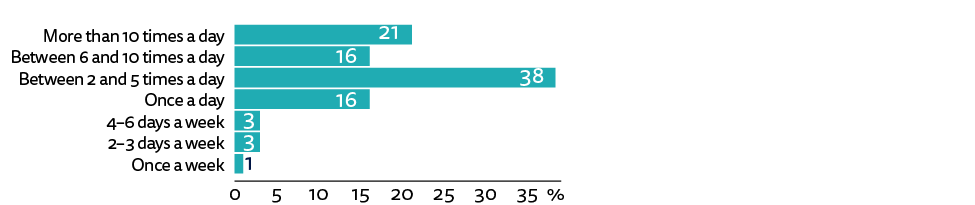 The survey shows that access to news in Turkey is slightly higher than average, as 91% of those surveyed report they access news once a day or more, compared to 89% across all markets (see Fig 5). However, the more revealing figure about the level of news use concerns those who access news more than five times a day, which is 37% in Turkey compared to 25% across all markets. A further 38 % of Turkish respondents access news between two and five times a day.