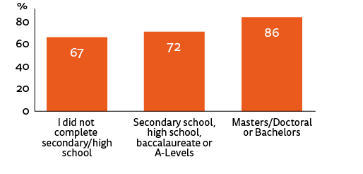 Interest in news clearly increases with the level of education (see Fig 11). Sixty-seven per cent of those who did not complete secondary/high school say they are ‘extremely’ or ‘very’ interested in news compared to 72% of those with secondary/high school or A-levels, and 86 % of those having a university education (BA, MA or doctoral).