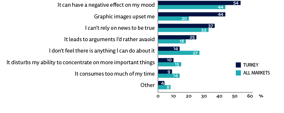 ‘I can’t rely on news to be true’ (37%) and ‘It leads to arguments I’d rather avoid’ (25%) are the two other main reasons cited for avoiding news in Turkey. While levels of distrust in Turkey and all markets are close, avoiding any possible arguments is higher in Turkey than the international average. Turkey is in fifth place across all markets in this category after South Korea (56%), Taiwan (44%), Croatia (34%), and Hong Kong (32%), with very low figures in most European countries. Strong polarisation in society might be the reason behind this high score in Turkey.