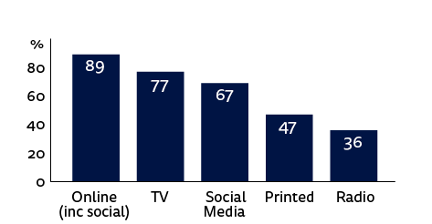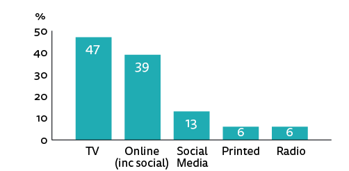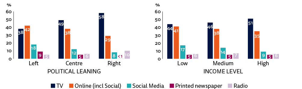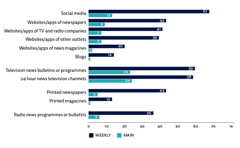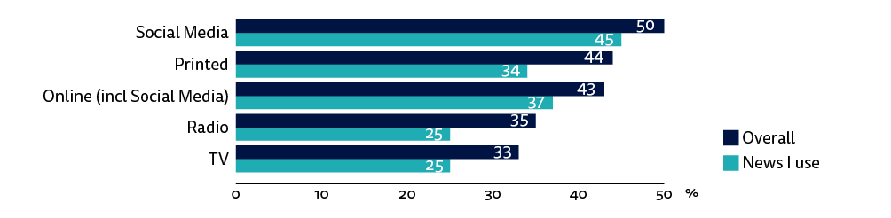 - While television (33%) has the lowest level of distrust in news overall, social media (50%) and printed newspapers (44%) have the highest level.