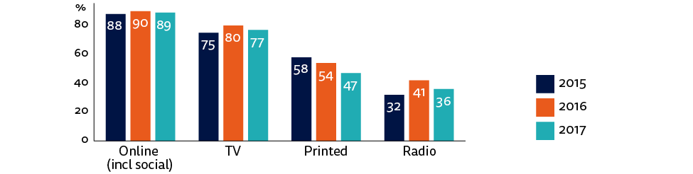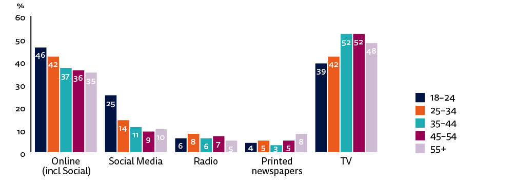 Online, including social media, is at the top of the list of sources of news used weekly, with a weekly reach of 89%, followed by TV (77%), printed media (47%), and radio (36%). However, judged by main news source, TV is first with 47%, and online, including social media, (39%) follows it. The shares of printed media (6%) and radio (6%) are quite low.