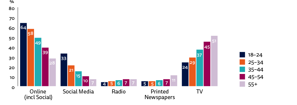 - • Younger groups are much more likely to use social and digital media as their main source of news, while older groups cling to the habits they grew up with (TV, radio, and print).