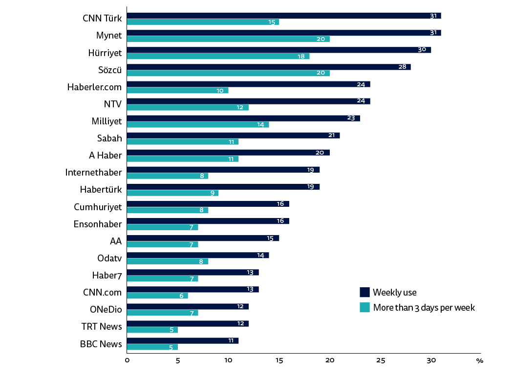While successful digital-born sites such as OdaTV (14%), OneDio (12%), T24 (8%), Diken (6%), and Bianet (2%) have retained their leading position in our survey compared to last year, the number of digital-born news brands has increased this year. These include Duvar, Karınca, Webiztv, Özgürüz, Artı Gerçek and 140journos, a prominent citizen journalism project that has gained attention for its pioneering use of social media to distribute content. Another approach comes from Journo, which provides a platform for freelance journalists and ensures they are paid via the MATRA human rights funds. Well-known reporters, many of whom have lost their jobs in recent closures, often contribute to this portal with exclusive stories. The Turkish sections of international brands such as BBC Turkish and DW also produce strong news stories about Turkey for use by people in-country or Turks abroad.