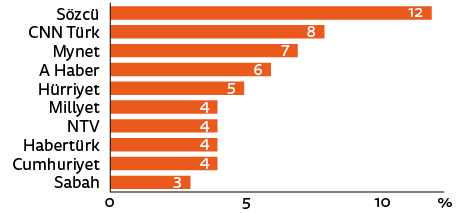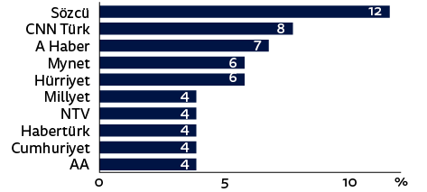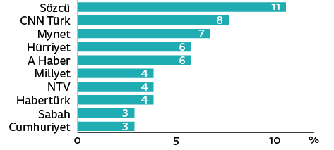 - Sözcü, critical of the ruling AK Party, clearly dominates three categories in best online media outlets, including providing ‘accurate and reliable news’, ‘strong viewpoints/opinions’, and ‘helping me understand complex issues’, with CNNTürk in second place.