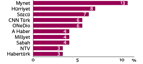 The most used online news sites, however, continue to be those provided by traditional media brands using content repackaged from print (Hürriyet, down five percentage points, and Milliyet down eight percentage points), television (CNN Türk, down six percentage points, and NTV down nine percentage points), or from news agencies, but their percentage has declined remarkably in the past year. Despite the decline in their popularity (Mynet, down five percentage points, Haberler, down seven percentage points, and Ensonhaber, down four percentage points), digital-born web portals, which aggregate stories from newspapers and agencies, also play a major role in Turkey. The decline both in traditional media brands and digital-born web portals, as the figures show, indicates that other online brands have received a share from them.