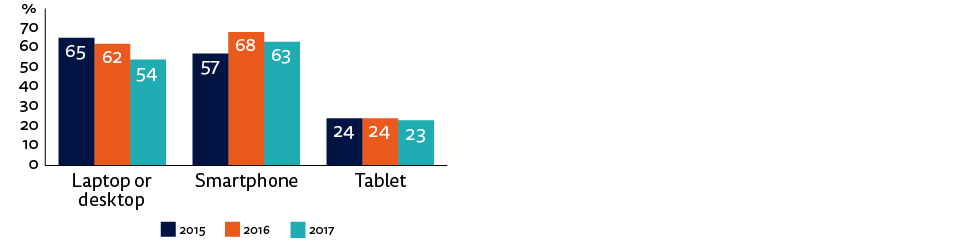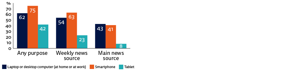In terms of devices used to access news online, laptop/desktop computers and smartphones are the most important, both as main sources of news (43% versus 41%) and in terms of overall weekly reach (computers 54% and smartphones 63%).