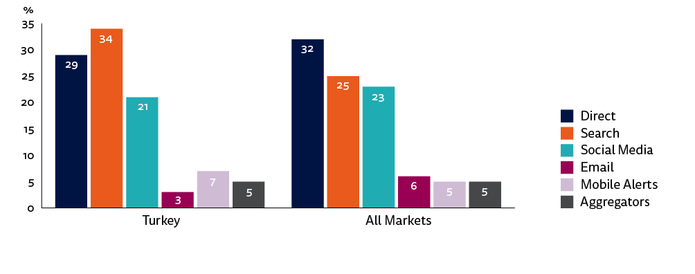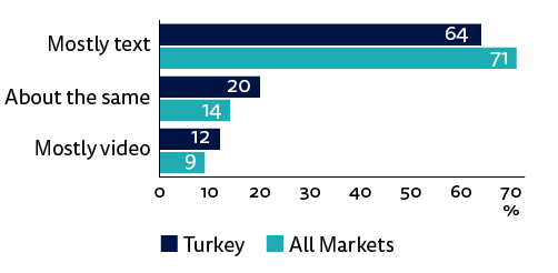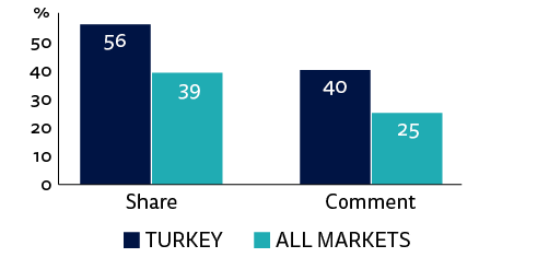 - 56% of respondents share news, and 40% of respondents comment on news in Turkey. Turkey is at the top for news sharing among European countries, and it is fifth across all markets, where Latin American countries (Brazil and Chile with 64%, and Argentina and Mexico with 63%) lead the way.