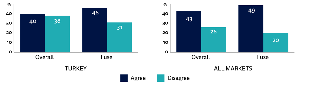 Although the small difference (six percentage points) between trust in news ‘overall’ (40%) and ‘I use’ (46%) might suggest low levels of political polarisation, this is not the case in Turkey, where society remains deeply divided. The same level of polarisation also applies to the media.