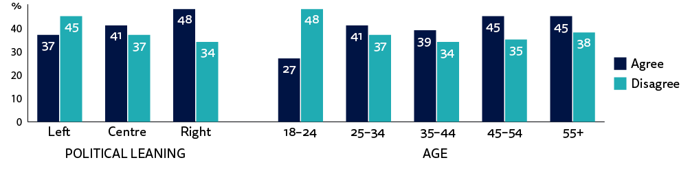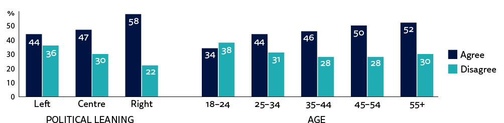 While only 20% of respondents think that news media is independent of undue political or government influence, trust in news overall is twice as high (40%). When we look at the political leaning of people who agree that news media is independent of undue political or government influence, there is a merked difference between those on the right (37%) and those on the left (17%).