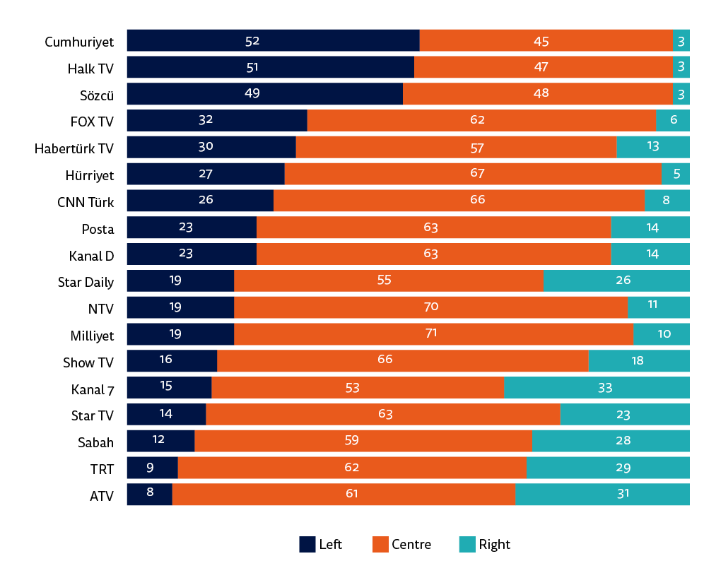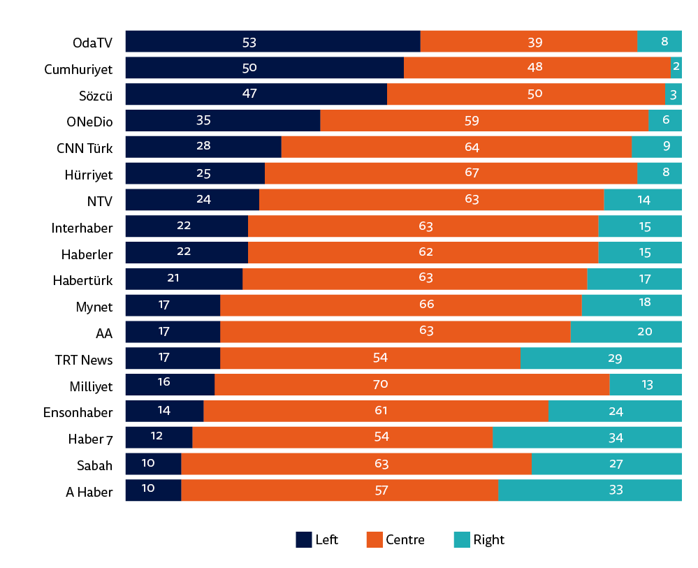 The digital-born brands Oda TV and OneDio draw a larger audience from those who are left-leaning. As to the news aggregators, Mynet, which is the most preferred source at the top of the list in this category, has almost the same audience from both the left and the right. Internethaber and Haberler are more popular on the right than the left, and Ensonhaber is the opposite. Surprisingly, the ratio of respondents from the right or left who consume news from the official Anatolian News Agency is similar.