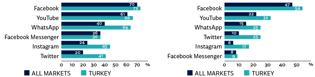 First, as shown in Figure 49, we see that all social media networks and messaging applications are more popular in Turkey than the average of all markets. (With the exception of Facebook Messenger for any purpose.) The difference between Turkey and the average of all markets is particularly high in the use of WhatsApp, Twitter, and Instagram, both ‘for any purpose’ and ‘news’. Twenty-five per cent of respondents in Turkey use WhatsApp for ‘news’, whereas the average in the survey is 15% (see Fig 50).