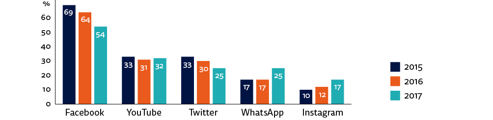 It stands out that the use of Facebook for news fell by ten percentage points in the last year, with Twitter down by five points. The sharp downturn in the use of Facebook and Twitter for news may be related to fears of government surveillance. The rise of closed messaging services like WhatsApp (an increase of eight percentage points from 17% to 25%) as a way of sharing news may be linked to a climate where it is unsafe for public servants, in particular, to criticise the government on social media.