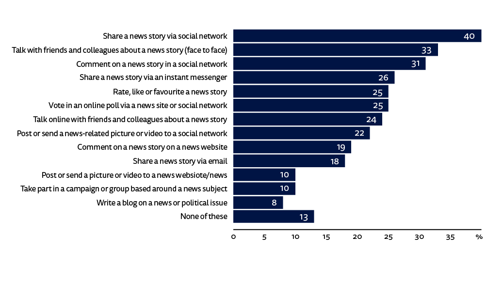 Despite the higher level of sharing and commenting, 33% of respondents talk with friends and colleagues about a news story face to face (see Fig 54).