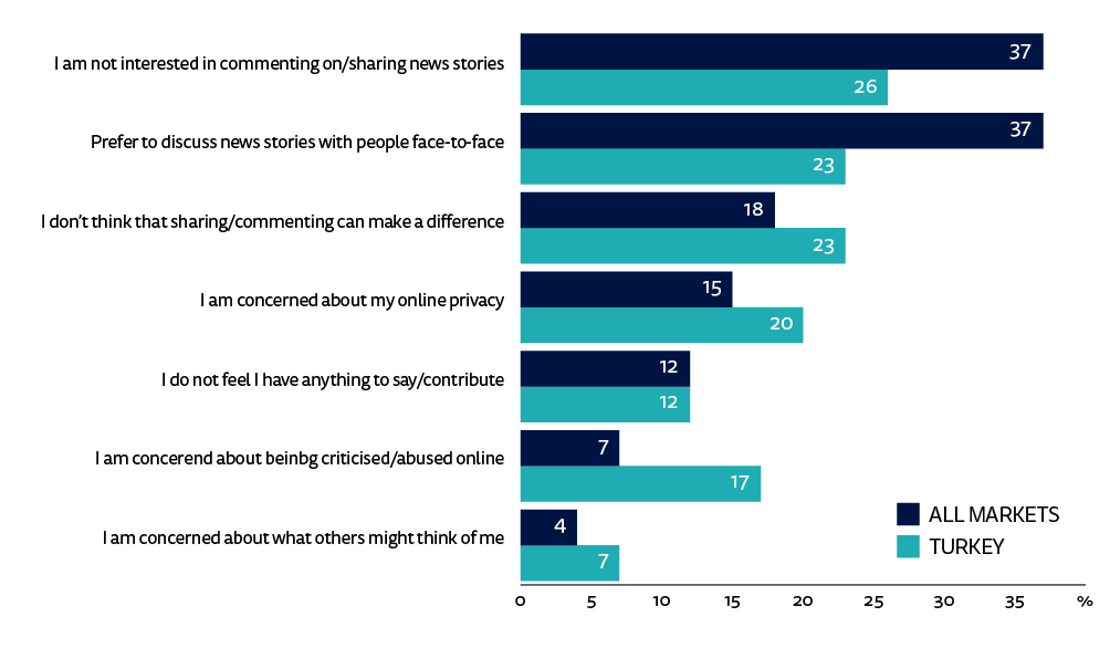 When looking at reasons why Turkish people do not share or comment on the news, we see some interesting trends compared to other countries. The three leading reasons given by Turkish respondents, as shown in Figure 55, are: a lack of interest in commenting/sharing (26% in Turkey versus 37% overall); a preference for face-to-face discussions (23% versus 37%); and/or a belief that it will make no difference, where the Turkish figure of 23% is ahead of the overall average (18%). Turkish respondents are also more concerned about online privacy (20% against 15% across all markets). The most striking difference is in the concerns about ‘being criticised or abused’, which is 17% in Turkey against an average across all countries of 7%.