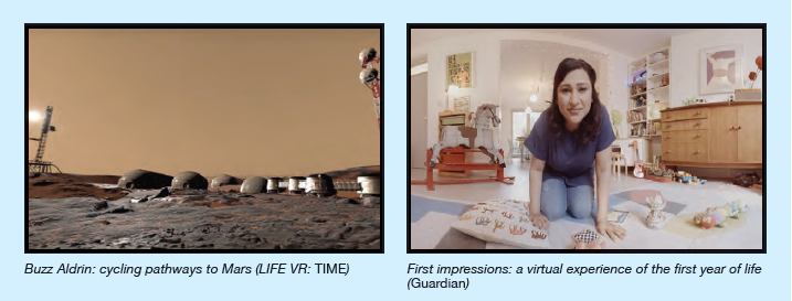 The New York Times, which led the way with its VR app, committed in November 2016 to publishing a daily 360 report, now displayed prominently on its home page and news app. Many other news organisations have launched apps intended for viewing on cardboard headsets, introduced 360 players to their websites, and published regular VR content. Some now prominently feature ‘virtual reality’ sections in the top navigation of their websites – for example, Euronews, CNN, Blick.