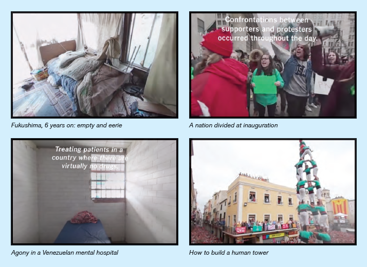 Low-cost cameras can be distributed to bureaux around the world: this model has been followed by the New York Times, CNN, USA Today, Euronews, the BBC, and others. The downside is that the footage is relatively low quality, though acceptable for viewing on a mobile device. But it is only a matter of time before the technology improves.