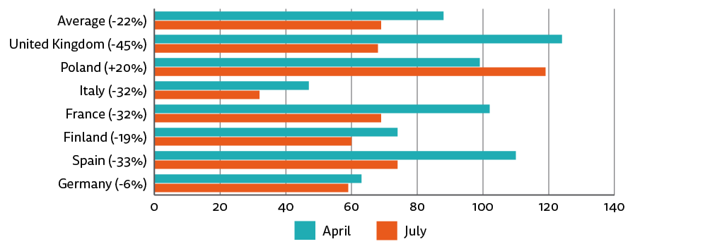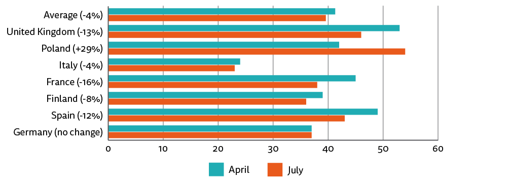 Figure 3. Third-party cookies per page by country (April-July change in parenthesis)