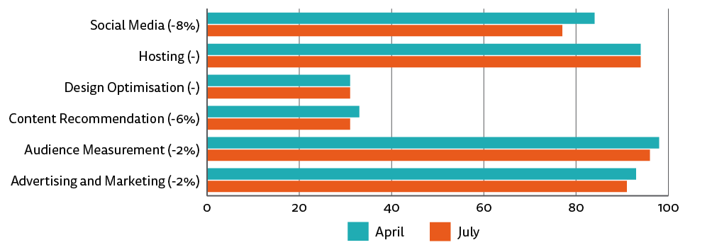 Google, which was present on 97% of all the news sites covered in April and 96% in July, hosts a variety of services, and as Table 1 shows, has seen some slight decreases in reach when looking at specific services.