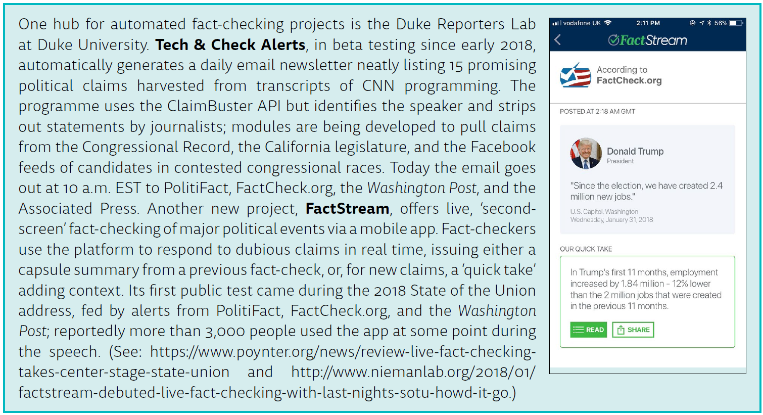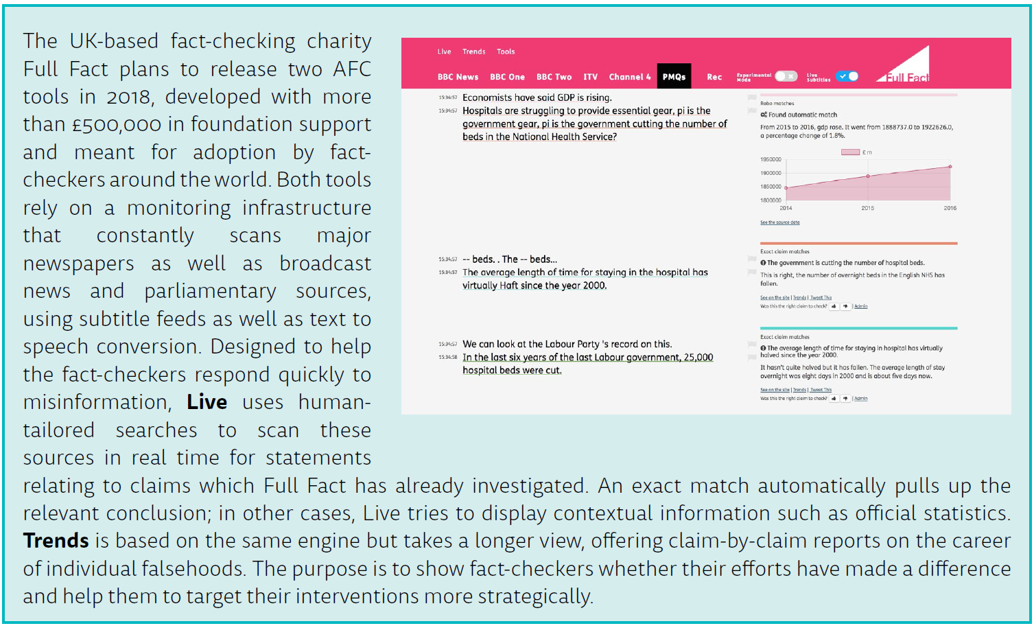 A number of fact-checking outlets are beginning to use this internally as a way to flag repeat offenders. For instance, Full Fact’s in-house AFC platform constantly monitors an array of media outlets, as well as Prime Minister’s Questions, for claims the group has already checked (see box page 6). Similarly, the Duke Reporters Lab expects to test a system within months which will match statements chosen by ClaimBuster against the libraries of FactCheck.org, PolitiFact, and other fact-checkers who use Share the Facts, a common tagging system that now covers more than 10,000 fact-checks.5 In this way, the software will be able to identify an interesting claim and point to related fact-checks, which may yield a ‘quick hit’ story, explains lab co-director Mark Stencel: