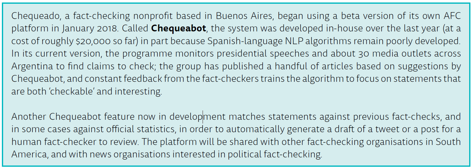 Real-world AFC tools are developing rapidly. Supported by foundations, platform companies, and other charitable sources, a handful of fact-checking organizations on different continents have emerged as hubs for developing and implementing automation technologies for the wider global community of political fact-checkers based in news outlets, universities, and civil-society groups. Several outlets are now using automation in a supporting role to help find interesting and important political claims to check. Progress is also being made in matching some claims against previous work; despite limits, this year will see the official launch of new tools to track where false claims are being repeated and to automatically bring up related fact-checks or other relevant information to help fact-checkers intervene quickly.