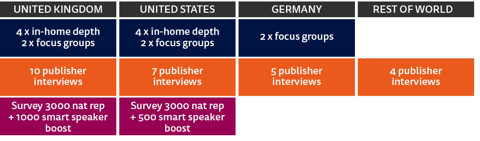 Working with Differentology, a UK-based market research agency, we conducted in-home depth interviews and focus groups in three countries (UK, US, and Germany) during August and September 2018. The aim was to understand the behaviour of early adopters who had been using news on these devices for six months or more, to understand how media habits had changed and how voice speakers fitted with a range of other devices. We ran a second series of groups with those who had not yet bought the device (but were open to the idea) to understand barriers to purchase. Both groups were exposed to a range of voice news experiences.
