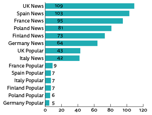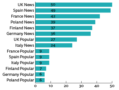 Seven countries were selected for this study to represent a mix of population sizes and media markets in the EU. The countries studied are Finland, France, Germany, Italy, Poland, Spain, and the United Kingdom. In each country, we included prominent news sites, selected on the basis of prior work measuring their reach and significance (Newman et al., 2017). The Alexa Web Information Service was used to select the top 500 most popular sites in each country to provide a baseline for comparison.